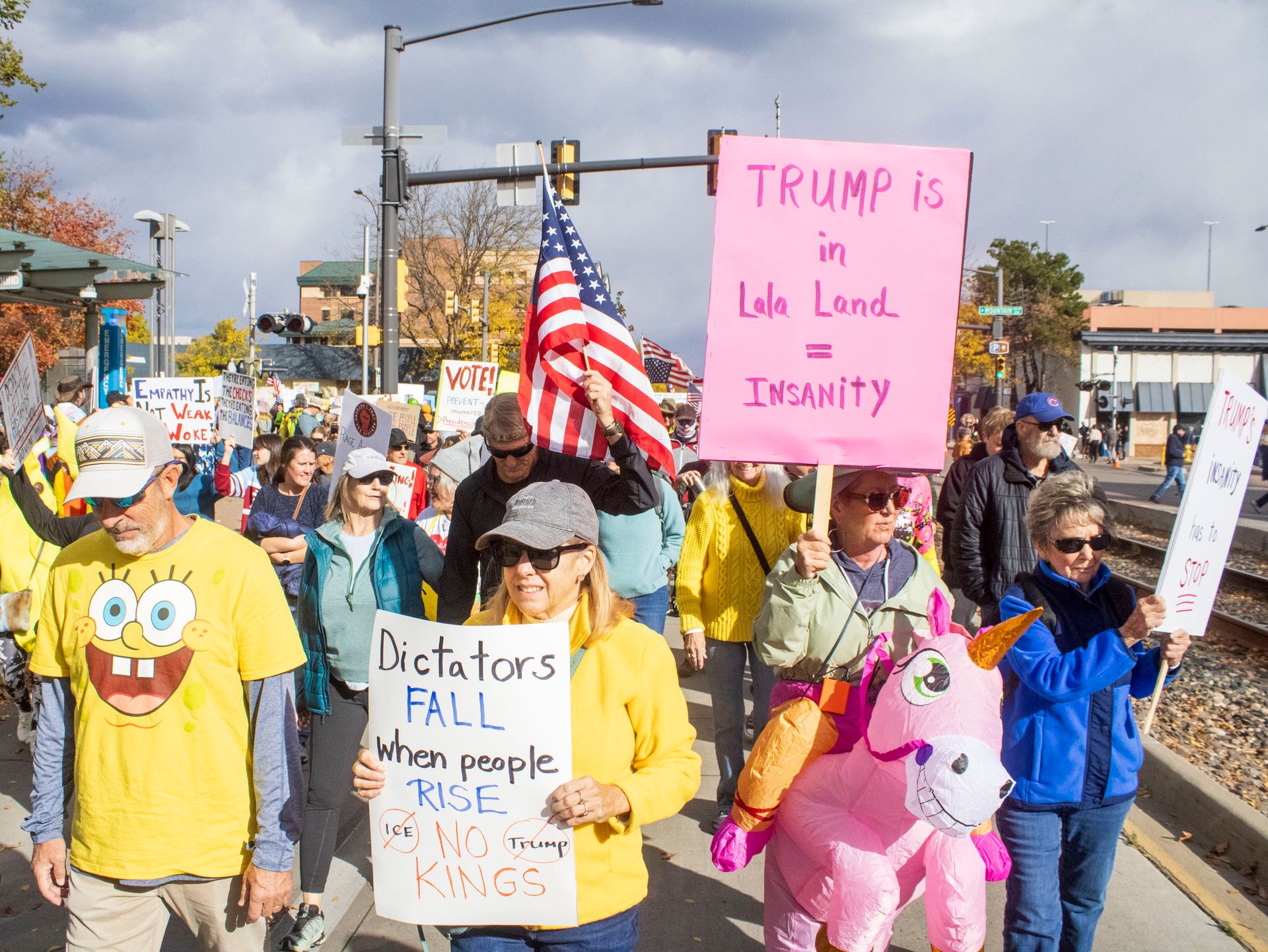 The call-and-response echoed into Old Town Fort Collins. Many protesters carried signs and some wore Halloween costumes. Others waved flags and some stood off to the side and recorded from their phones. Cars honked when they drove by, but many who were just visiting Old Town cheered and enjoyed the vibrant environment.